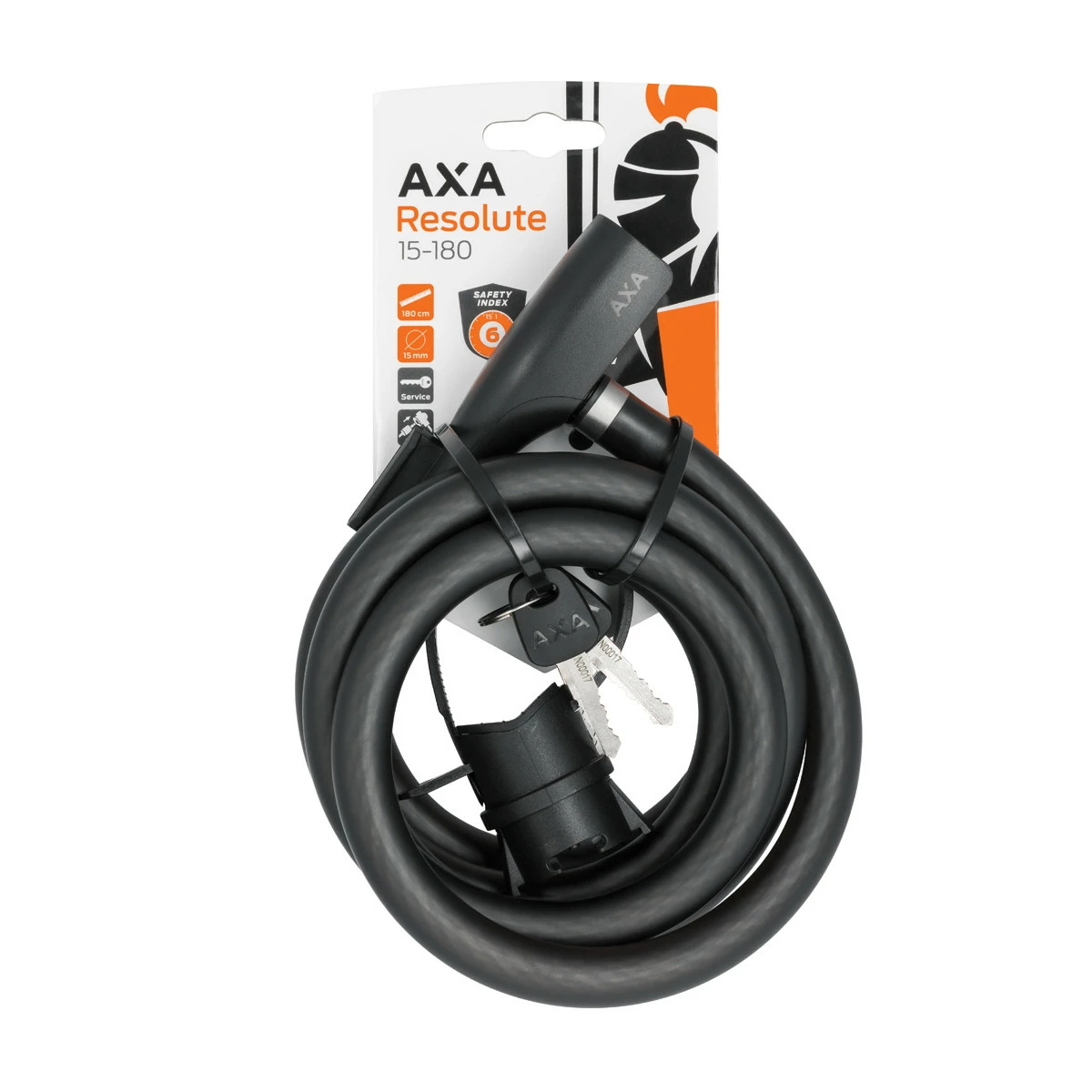 AXA Resolute 15-180 is suitable for shorter stops or as an additional lock. Made of hardened steel, the lock is 180 cm long and 15 mm in diameter. It comes with two keys and a clamp for attaching the lock to the bike frame. The clamp is also suitable for other Resolute models.