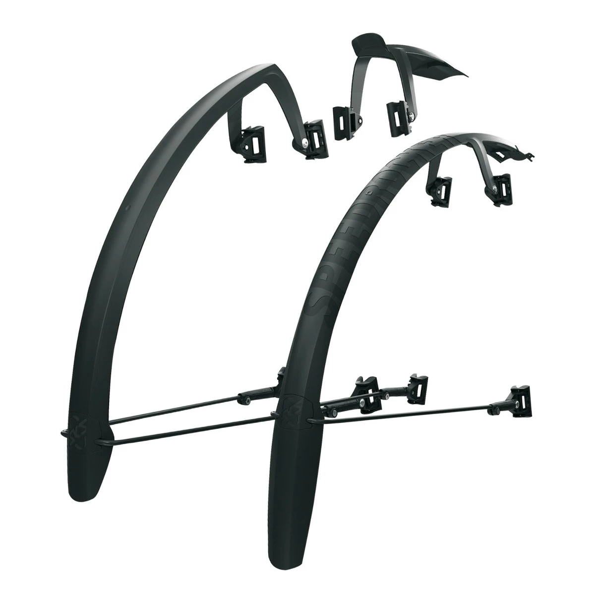 The SKS SPEEDROCKER shock-resistant plastic drillboards are specially designed for gravel, cyclocross and road cyclists. The front fork is in two parts, which are attached to the wheel fork by straps. The length of the backboard is adjustable, with a total length of 950 mm.