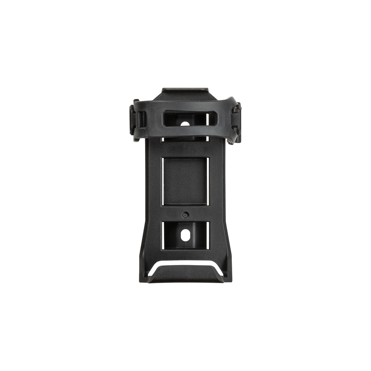It comes with two wrenches and a holder that can be attached to the bike frame above the bottle holder or attached with the included straps.